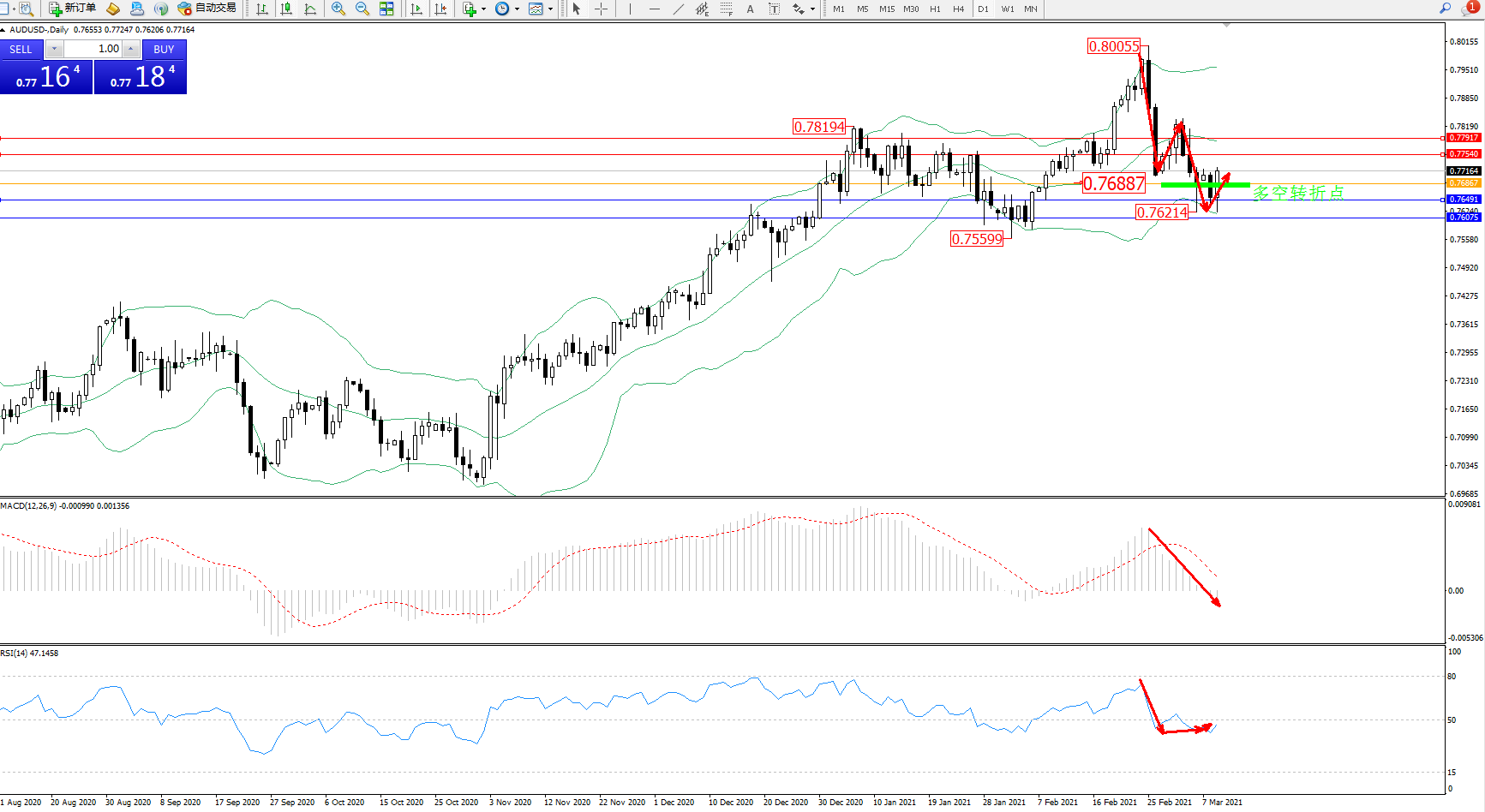 交易策略:0.76887上方看涨,目标0.77540、0.77917
