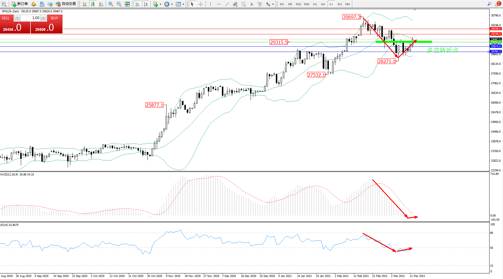 日经225指数3月12日(周五)收盘上涨500.86点,涨幅1.71%,报29712.50点。制定日本经济战略且颇具影响力的执政党议员表示,日本需要把追加预算中近7000亿美元的规模扩大一倍,以确保经济从疫情中复苏。本需要再一项规模庞大的财政措施,力度要与美国刚刚通过的纾困法案相当。他此前在起草安倍经济学的财政和货币政策框架中扮演关键角色,并且准备向现任首相菅义伟提交新的建议。日本央行自己无法再做更多的事情,尽管投资者对央行在下周政策评估中可能会有何行动感到不安。 据悉日本央行考虑政策评估后允许国债收益率更自由波动。需要效仿美国的行动路径来大胆行事,有些人还处在严峻的环境中。日本东京单日新增新冠肺炎感染病例304例。
