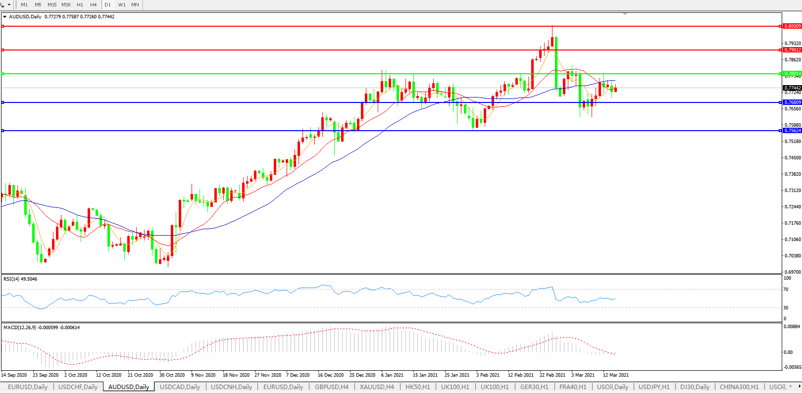备选策略:0.7800上方看涨,目标0.7900、0.8000