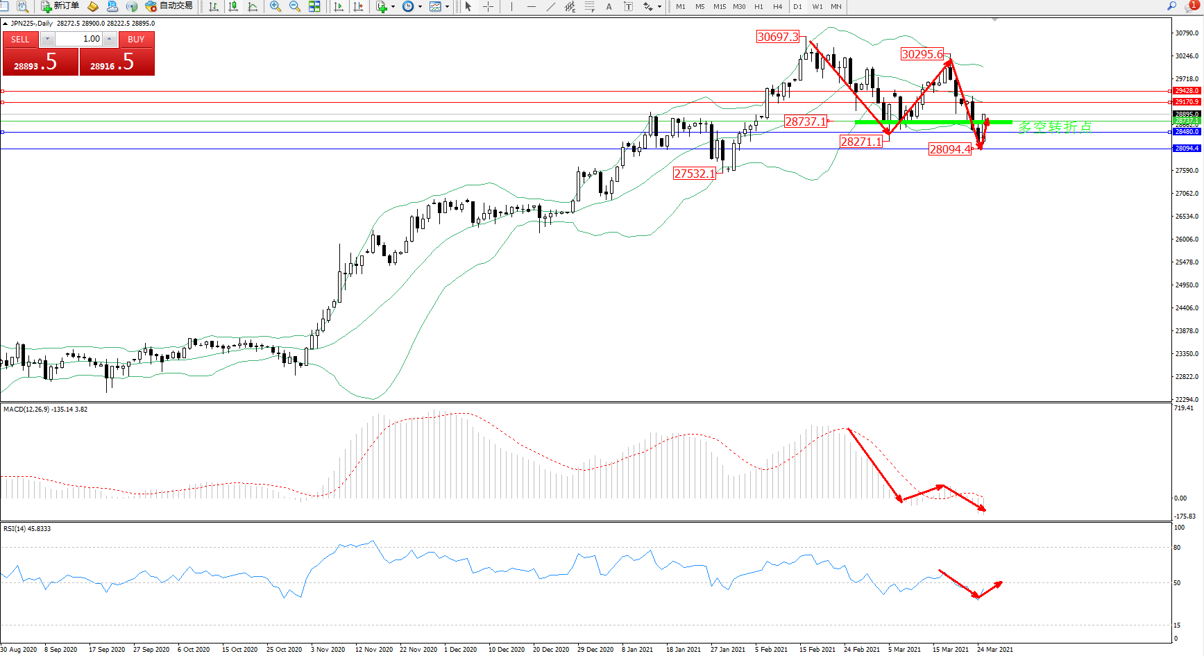 技术点评:长时间维持在布林带指标通道内宽幅震荡向下移动中,抵达28094位置节点后多头动力开始反转上扬,低位多头买盘伺机入场强势回升,布林带指标呈向下移动趋势走势中,MACD指标处于0轴线附近震荡后开始不断下移,RSI指标空头动力下行破50均衡线后反转缓慢回升;