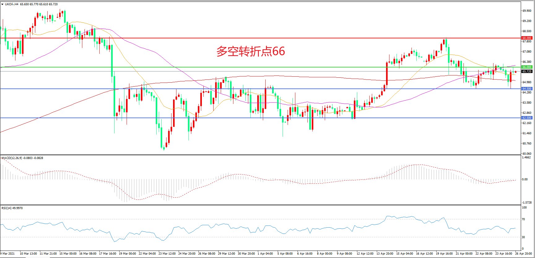 4小时图看,油价回踩64美元附近后小幅反弹,短期走势陷入震荡,66美元成为多空分水岭,均线系统逐步粘合,MACD绿柱缩短,RSI指标向上,日内延续震荡概率较大。