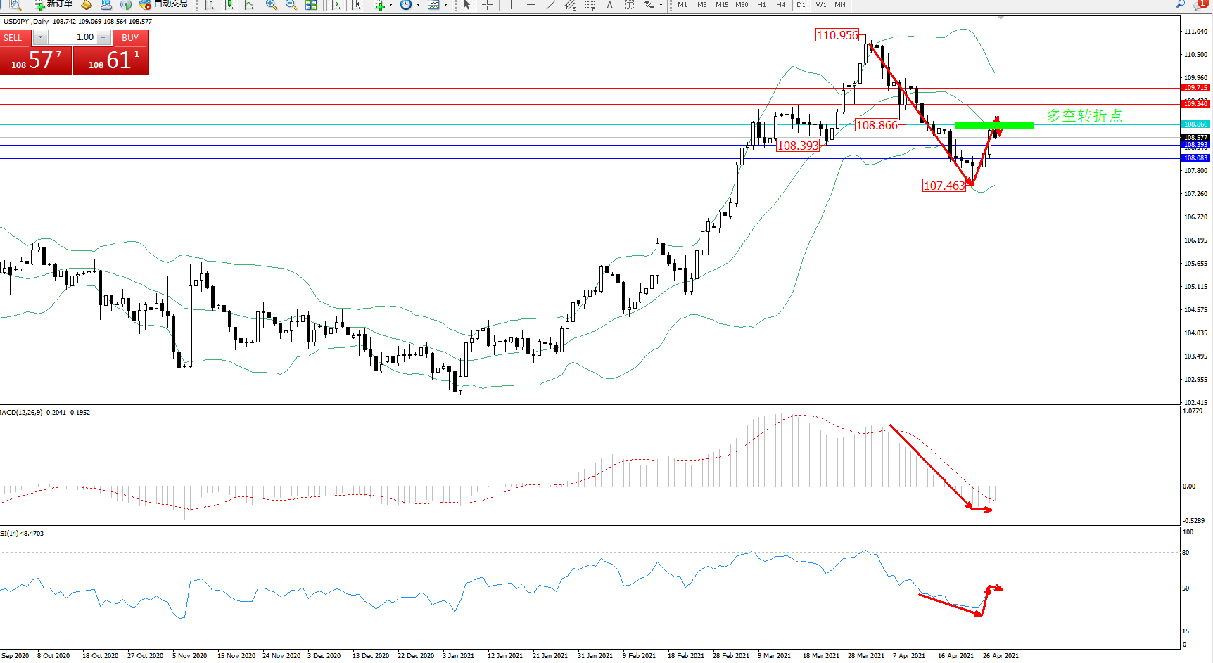 技术点评:高位空头动力延续空头下行走势持续下挫,触及布林带指标下轨附近节点后不断向下移动,空头动力下行至107.463附近得到支撑短暂整理后急速回升,突破中轨附近节点后反转震荡下行,布林带指标呈张口走势后开始缓慢收口中,MACD指标处于0轴线下方空头区域持续震荡后开始有回升迹象,RSI指标处于空头区域整理后急速反转上行,触及50均衡线节点整理;