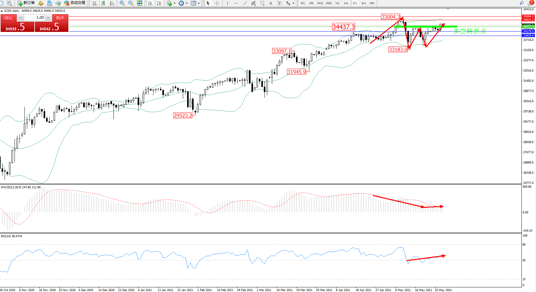 道琼斯指数5月28日(周五)收盘上涨65.73点,涨幅0.19%,报34530.37点;美股收盘,三大股指齐涨,股市连续第四个月上涨,强劲的经济数据抵消了通胀忧虑对市场的影响。周一美国纽约证券交易所阵亡将士纪念日,休市一天。尽管核心PCE指数创下二十年来最大涨幅,但交易员们更关注的是财政支出增长可能对经济前景有利。拜登周五发布了上任以来首份完整预算案,详细说明了大幅扩大联邦政府规模和范围的计划。下一个财政年度联邦支出超过6万亿美元。投资者认为最新数据不足以促使美联储改变货币政策或所持立场,这个想法也对股市人气带来提振。鉴于美国经济的优异表现短期内不会消失,股市料保持升势。需求前景看上去非常强劲,尤其是在美国,欧洲情况也确实在改善,人们乐观认为,发达经济体到今年夏末就将摆脱新冠疫情。