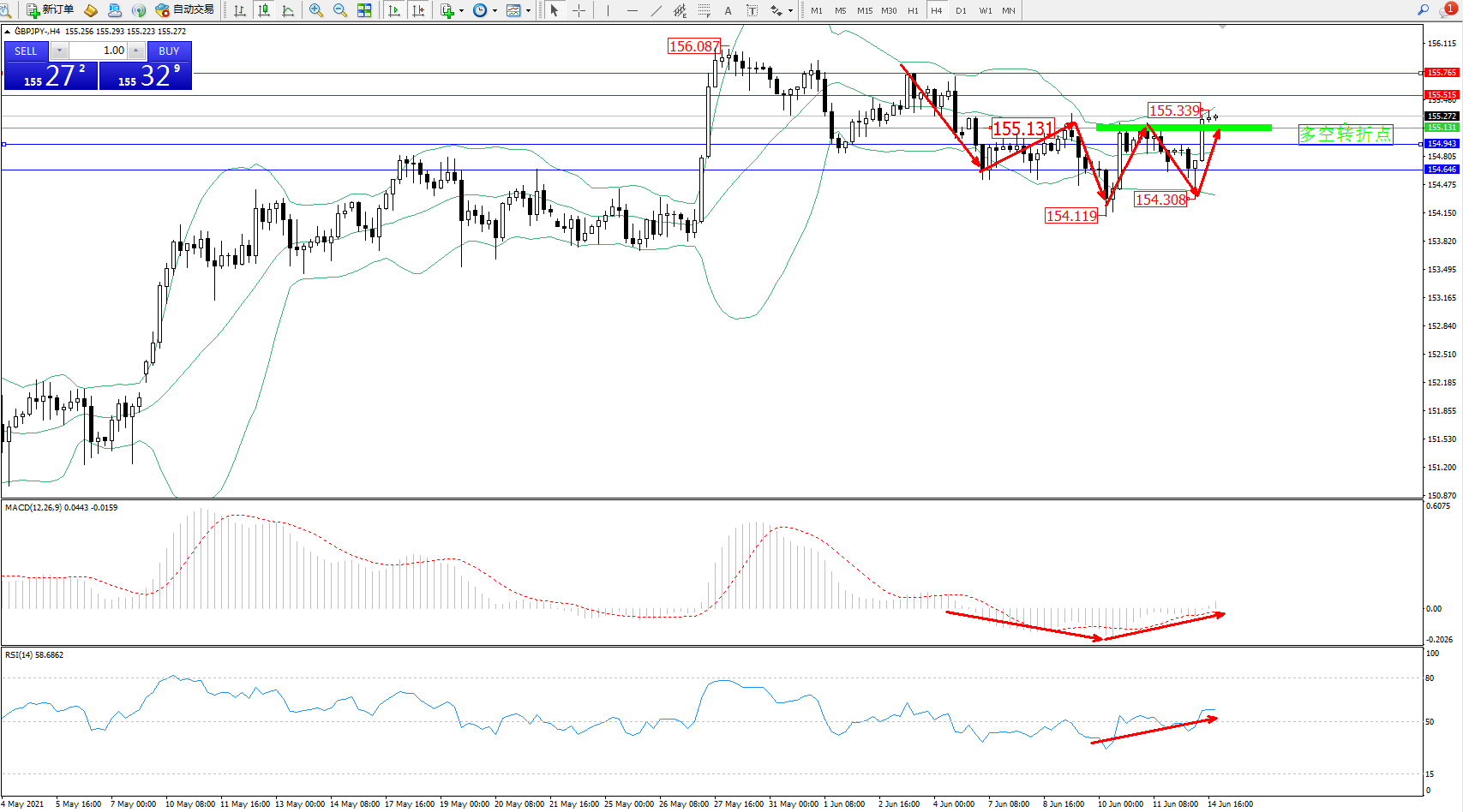 技术点评:空头动力延续布林带指标通道中内持续宽幅震荡向下移动中,低位抵达154.119位置后得到支撑,开始反转宽幅震荡向上移动,多头动力开始伺机入场,触及布林带指标上轨附近节点后开始整理,布林带指标呈缓慢张口走势中,MACD指标低位多头动力维持在0轴线附近弱势整理后开始向上移动,RSI指标处于50均衡线附近持续震荡后开始拉升上扬;