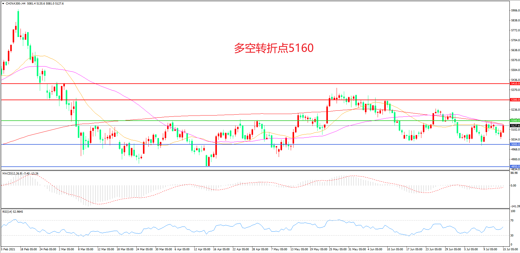 4小时图看,沪深300震荡反弹,短期行情有所缓解,但依然受制于均线阻力,高点逐渐降低,5000点成为下方支撑,MACD红柱增加,RSI指标向上,日内延续震荡概率较大。