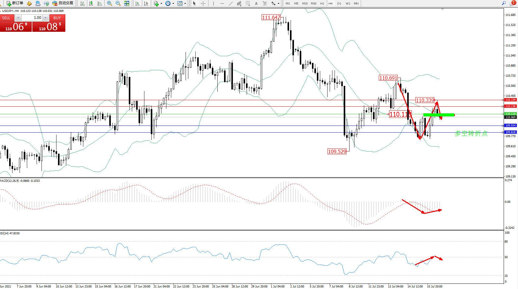 技术点评:高位空头动力持续震荡下行,短暂回升至中轨上方110.339位置后遇阻回撤下行,跌破中轨附近节点后有继续下行态势,布林带指标呈张口走势后开始收口向下移动中;MACD指标处于0轴线下方空头区域维持整理平缓上移,RSI不缓慢上移至50均衡线附近弱势整理中;