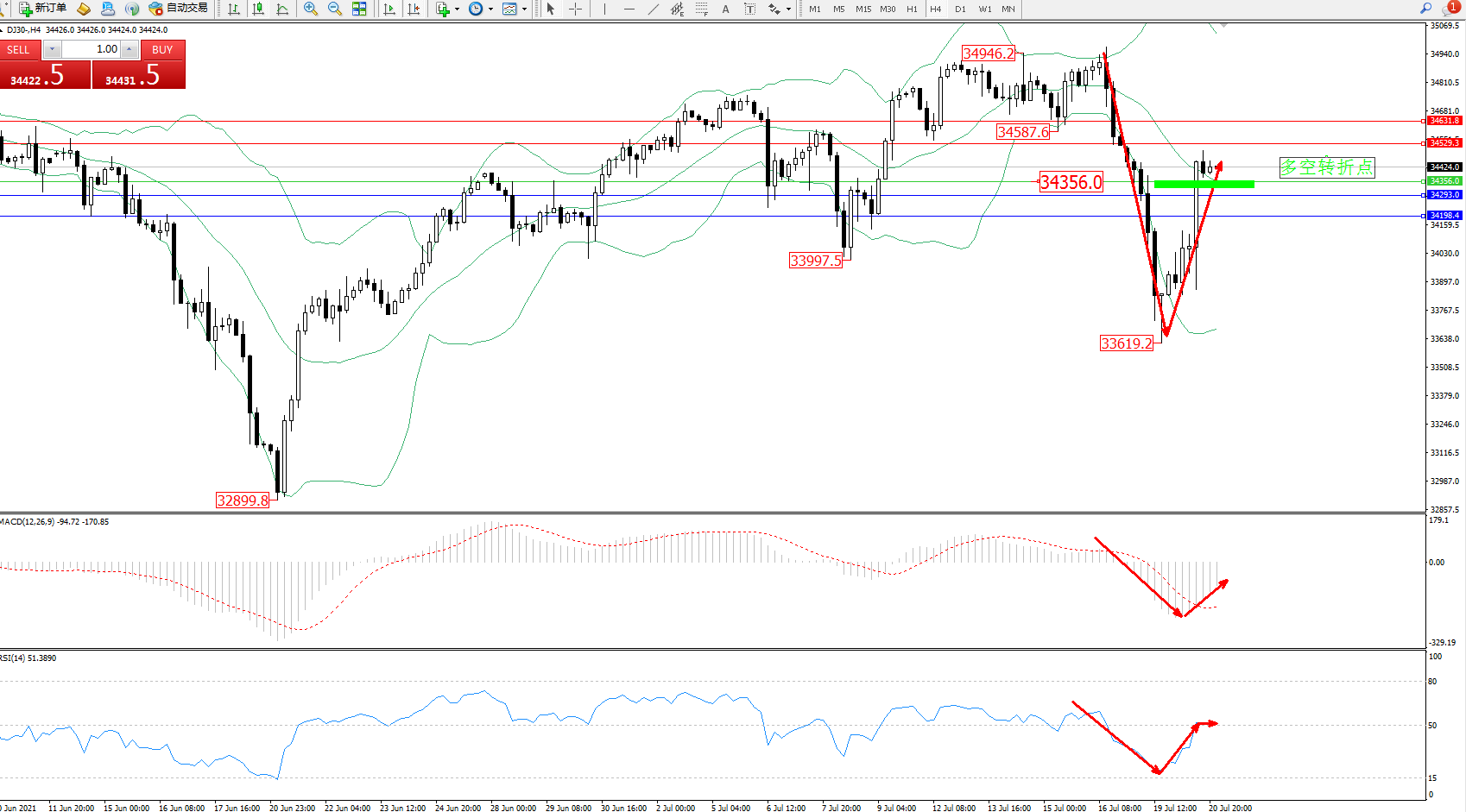 技术点评:空头动力延续布林带指标下轨附近持续震荡下挫,低位抵达33619位置后得到支撑,呈V型反转上扬,触及中轨附近节点后开始整理中,布林带指标呈张口走势后开始缓慢收口中,MACD指标处于空头区域低位震荡上移中,RSI指标处于空头区域持续震荡上移至50均衡线附近徘徊中;