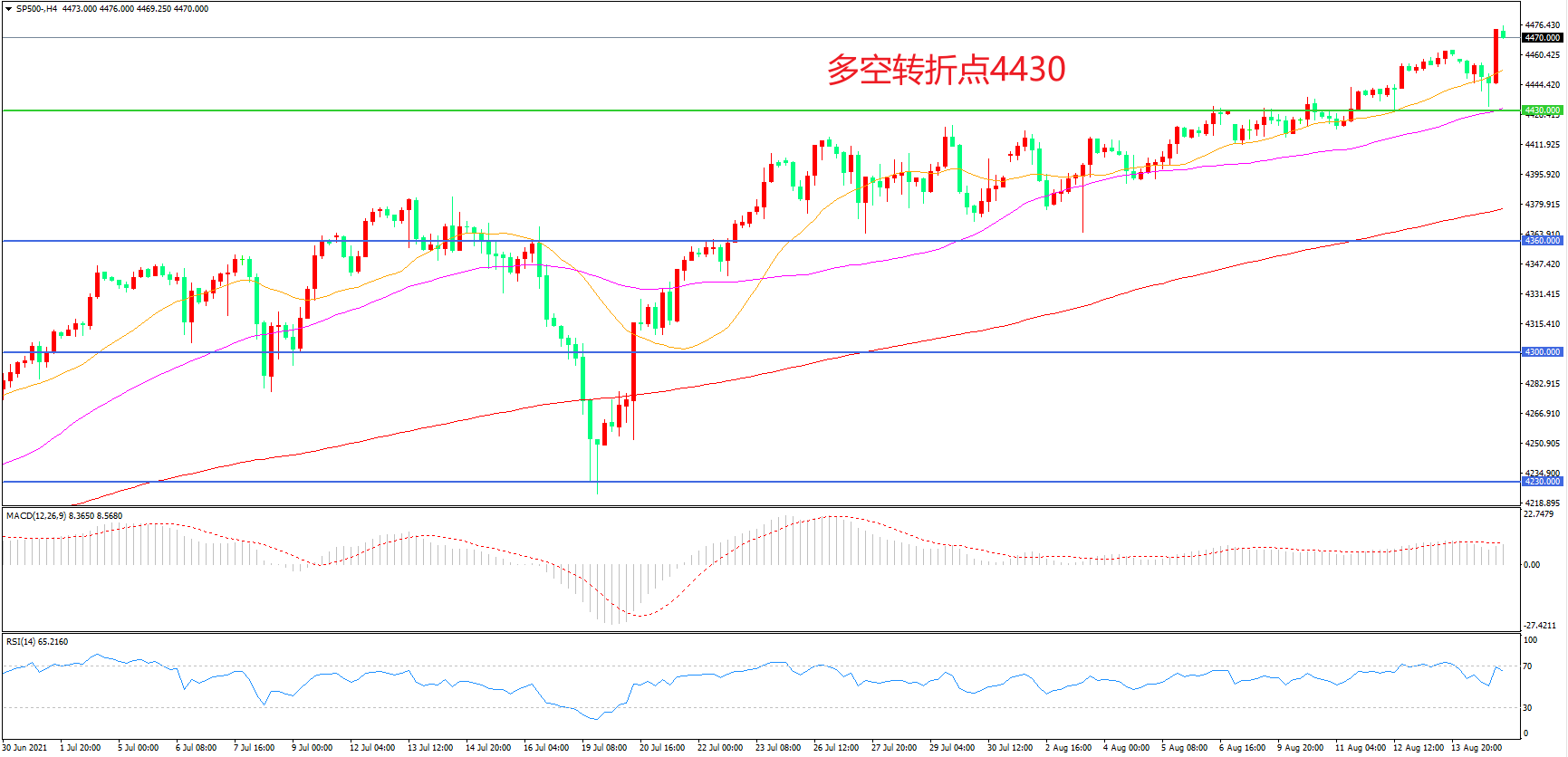 4小时图看,标普500回踩55周期均线后长阳拉升,短期表现偏强,均线系统呈多头排列,4430成为下方支撑,MACD红柱增加,RSI指标走平,日内震荡上行概率较大。