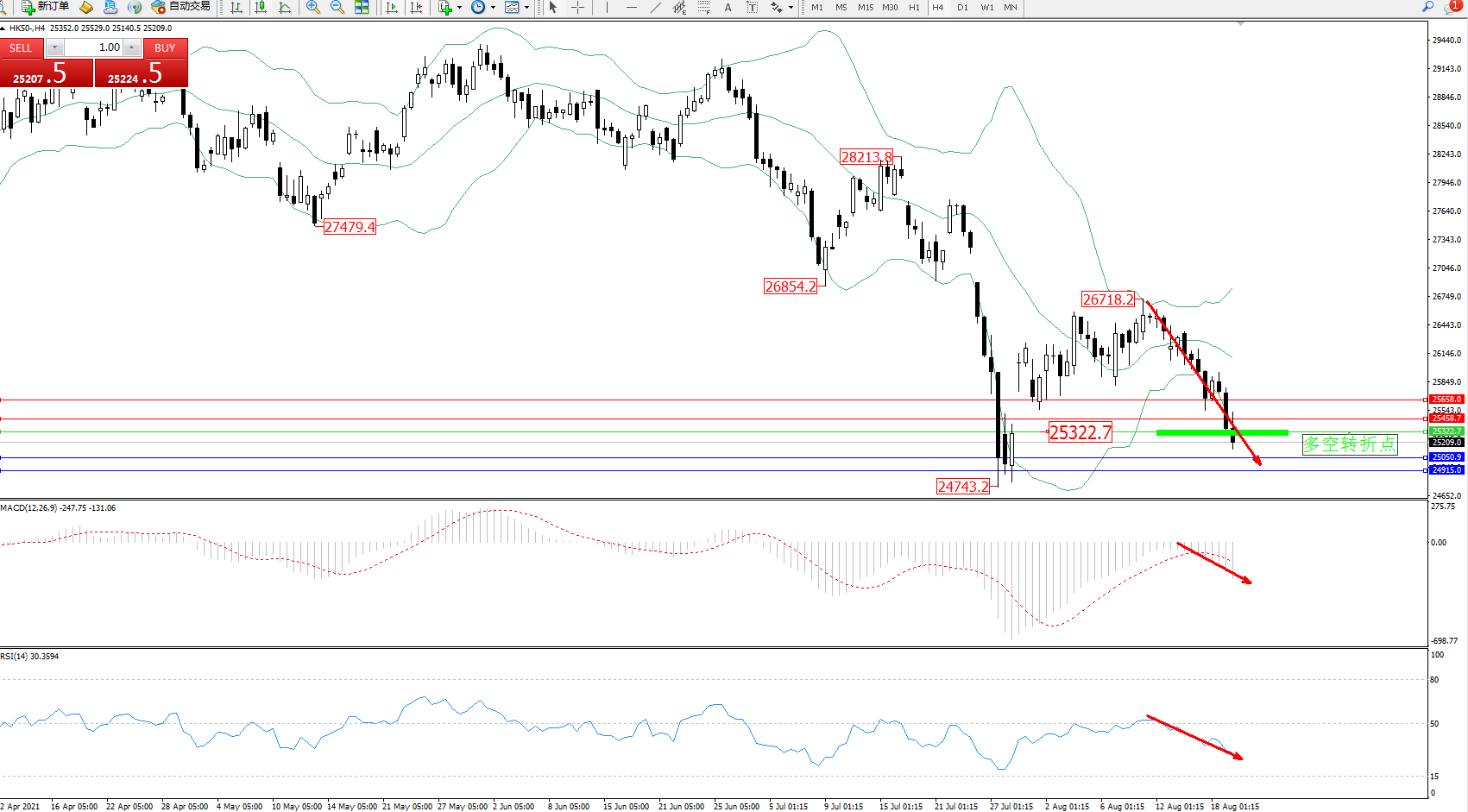 技术点评:空头动力延续布林带指标下轨附近持续下探,跌势未见止步迹象,前期低位24743位置近在咫尺,破位在即,布林带指标呈张口走势持续中,MACD指标处于空头区域持续震荡下行,RSI指标处于空头区域向下移动态势良好;