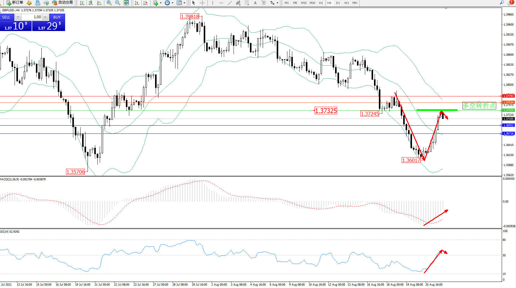 交易策略:1.37325下方看跌,目标1.36932、1.36716
