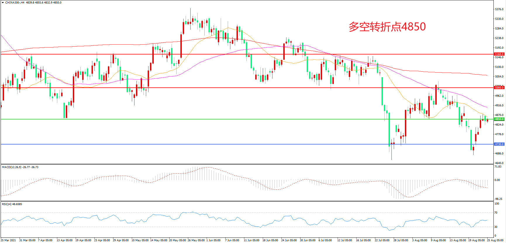 周三(8月25日),随着中报的披露进入末期,市场对于盈利增速预期加大,沪深300高开低走,收报4850点。两市合计成交1.31万亿元,北向资金净买入34.19亿元。中期来说,反弹行情并不代表真正的市场底部就此确立,部分蓝筹白马股的下行趋势,后续或对指数运行构成拖累,要做好随时向下遇阻回落的心理准备。