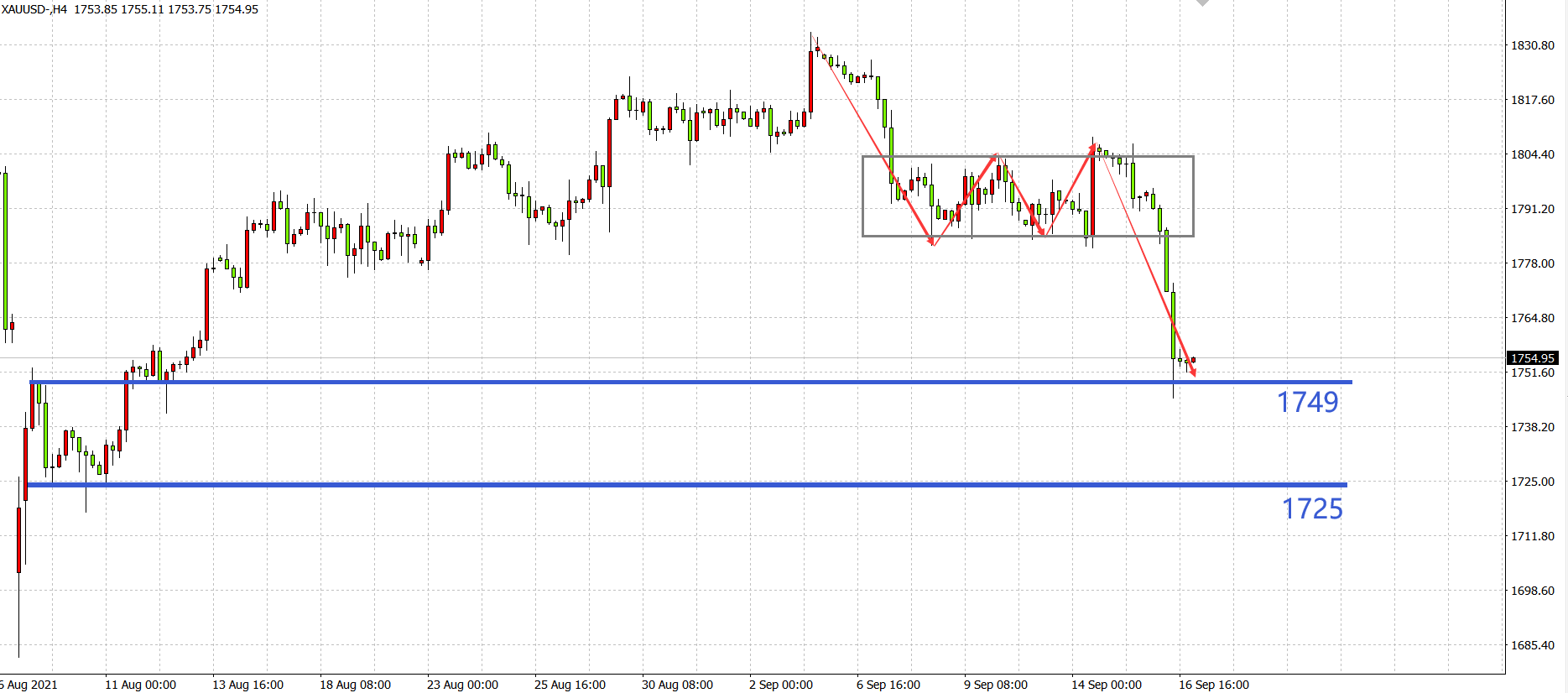 周四(9月16日)“恐怖数据”美国8月零售销售月率公布,录得0.7%,高于前值-1.10%与预期-0.8%,受此影响美指涨势欢欣鼓舞,现货黄金较日高回落46美元,一度跌破1750关口。短期来看,零售销售数据好转缓解市场对经济复苏的担忧,市场对于美联储的Taper与其加强,,鹰派美联储可能继续主导市场基调,在此基调下美元走强将打压黄金下行。