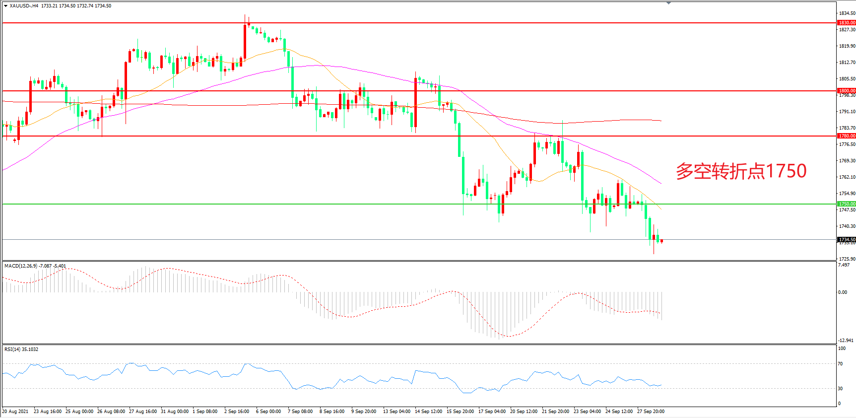 4小时图看,金价受制于均线系统压力破位下行,整体走势偏空,1750成为短期阻力,MACD绿柱增加,RSI指标走平,日内震荡下行概率较大。