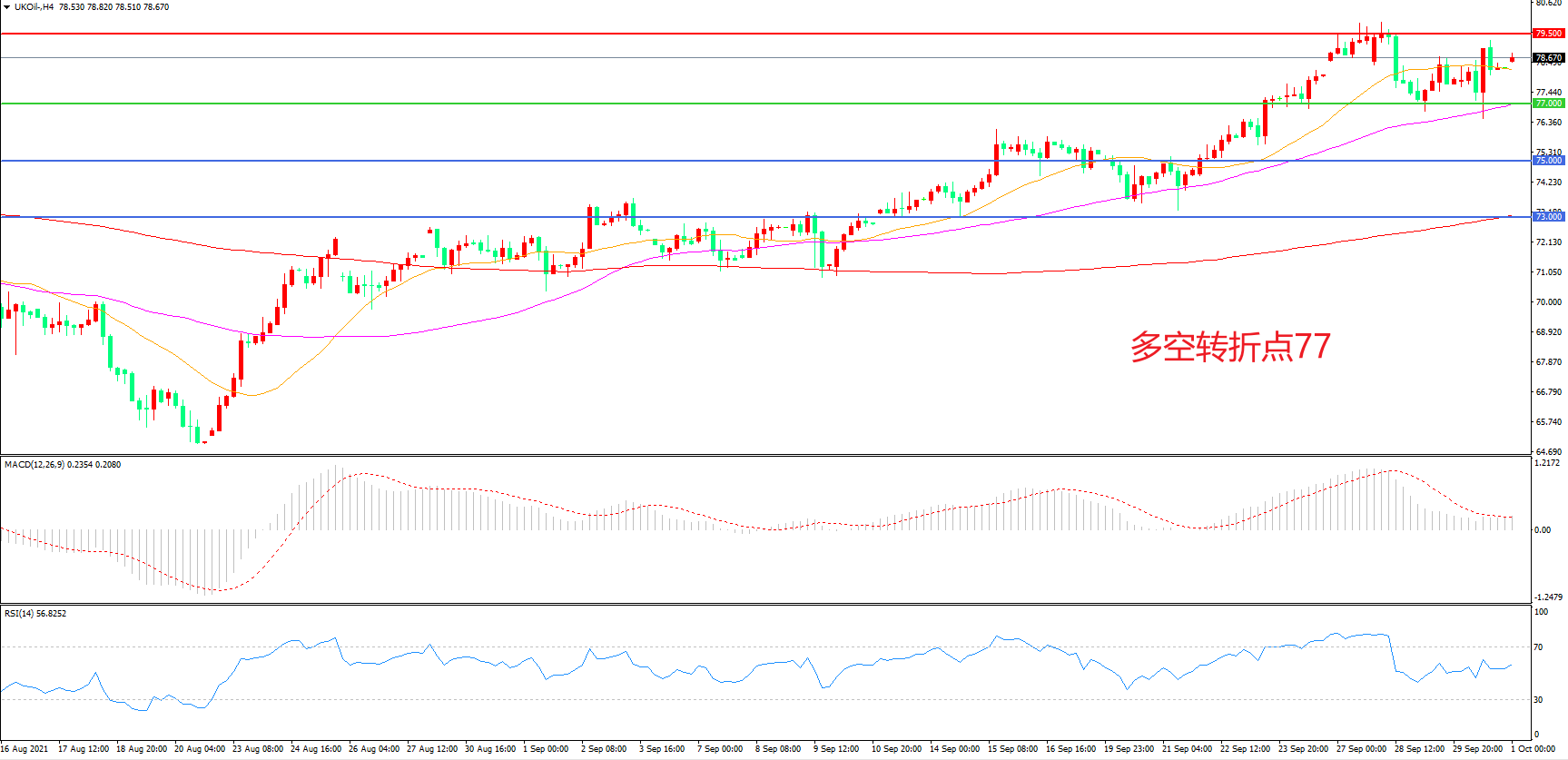 4小时图看,油价回踩55周期均线后再度拉升,短期表现较强,77美元成为短期多空分水岭,均线系统呈多头排列,MACD红柱增加,RSI指标走平,日内延续上行概率较大。
