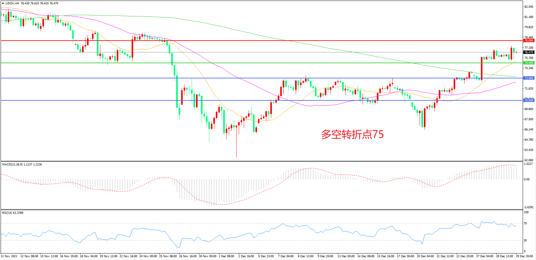 周三(12月29日),根据美国能源信息署数据显示,EIA当周原油库存下降350万桶,汽油、精炼油库存同步下跌,美国WTI原油受到提振,收报76.45美元/桶。需要警惕的是,美国石油产量已达到1180万桶/日,创2020年5月份以来新高,在元旦假期前,市场的交易热情恐怕会进一步的下降,油价或许将会维持在78美元附近进行震荡。