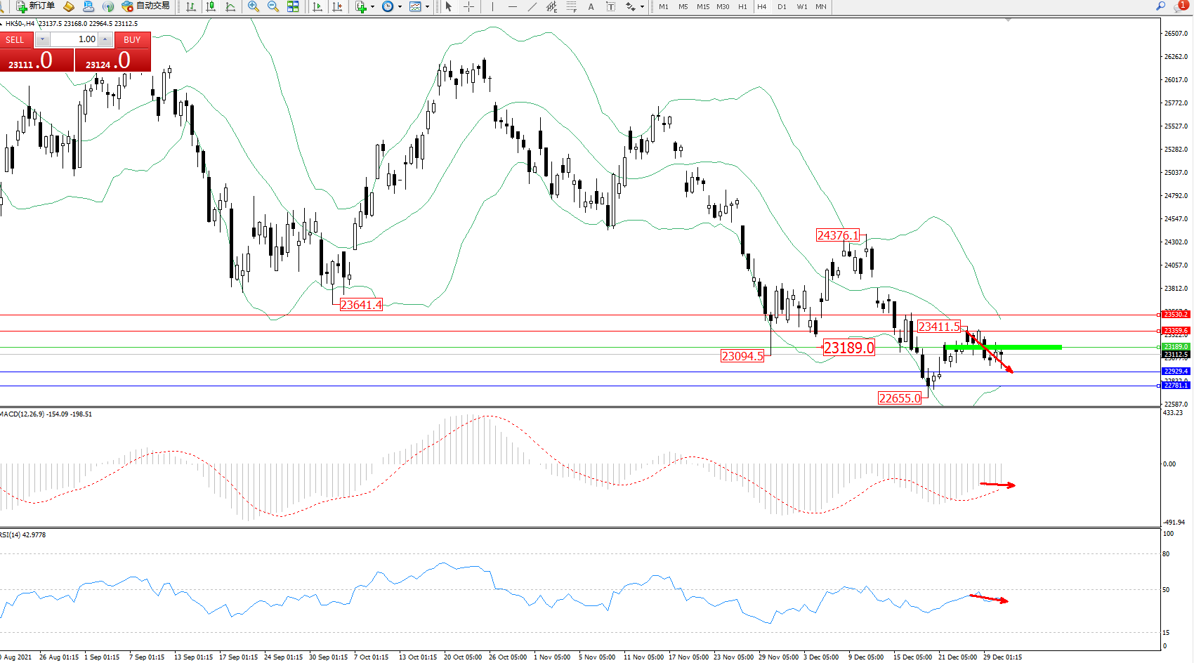 香港恒生指数12月30日(周四)收盘上涨25.47点,涨幅0.11%,报23112.01点;香港交易所元旦前夕,当天只进行早盘交易,12:00-12:10之间随机收市。港股三大指数收盘涨跌不一,恒生科技指数涨0.07%。大市成交额691亿港元。大型科技股涨跌各异,哔哩哔哩、百度跌逾2%,京东、美团、网易涨超1%;阿里巴巴跌0.63%,盘中再创上市新低。