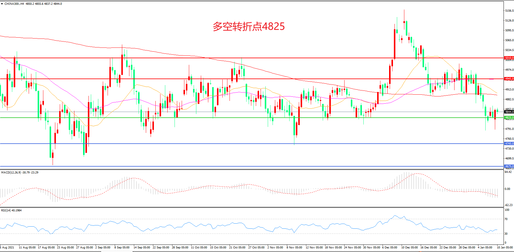 4小时图看,沪深300长阴下破后再度拉升,低位震荡迹象明显,4850成为阻力,4740成为下方支撑, MACD绿柱增加,RSI指标走平,日内震荡下行概率较大。