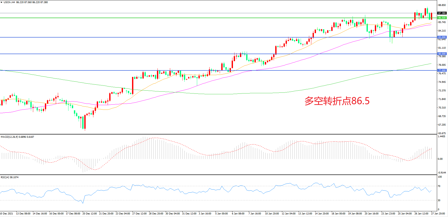 周四(1月27日),北约和美国明确拒绝了俄罗斯提出的两个诉求,地缘政治的担忧仍然存在,战争威胁支撑美国WTI原油高位震荡,收报87.30美元/桶。目前俄罗斯和西方国家在乌克兰问题上一直争执不下,加剧了对欧洲能源供应可能中断的担忧,原油价格的强势表明市场正在体现更高的政治风险溢价,重点关注后续事态发展。