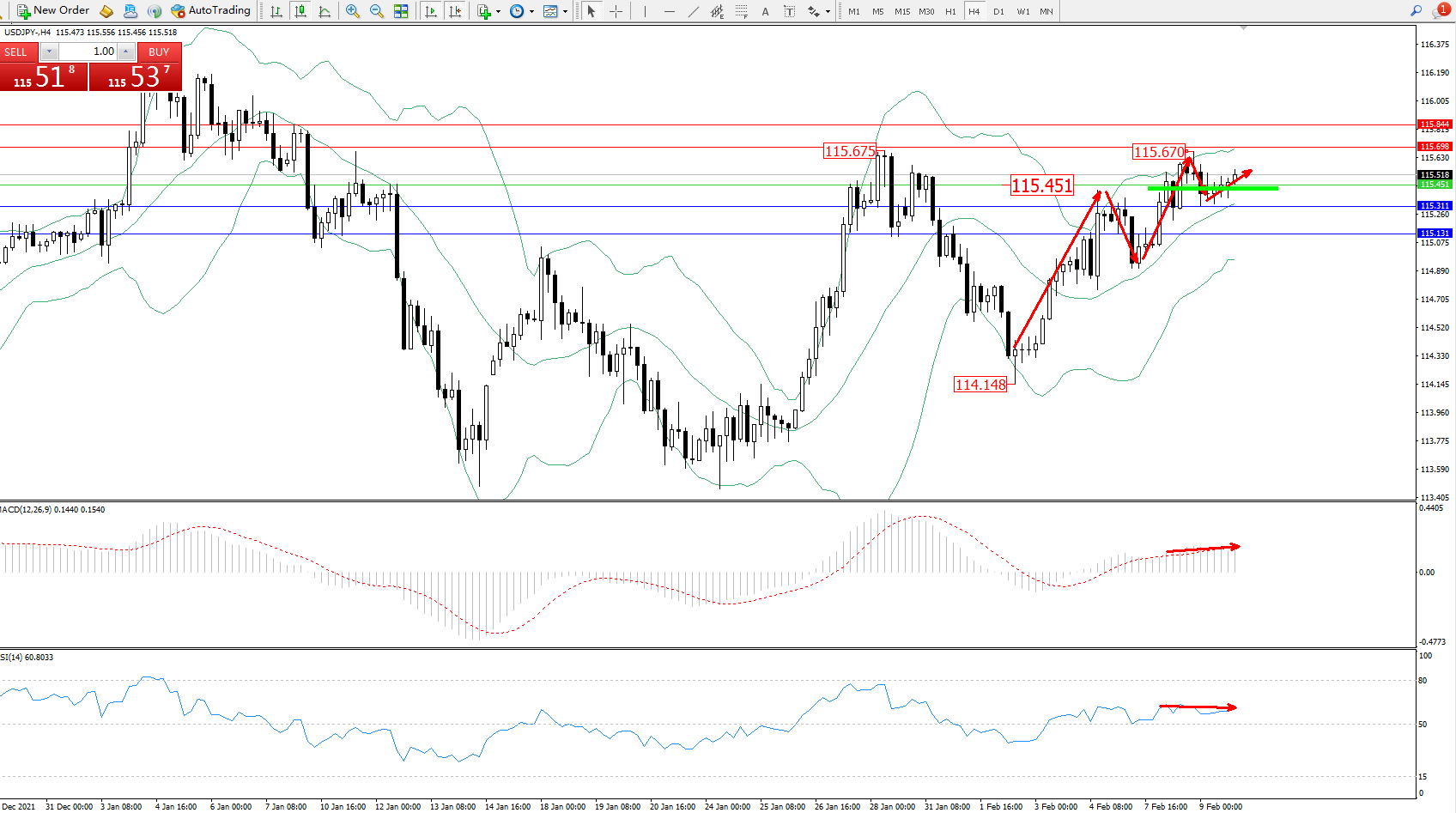 技术点评:多头动力延续布林带指标通道中上轨区间持续震荡上扬,高位抵达115.670附近节点后遇阻整理,多头动力有继续上扬态势,布林带指标呈上行趋势走势态势良好,MACD指标处于多头区域维持整理平移,RSI指标处于多头区域窄幅徘徊中;