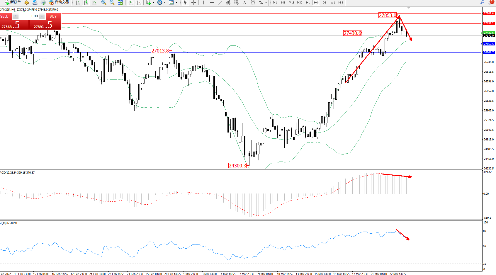技术点评:多头动力延续布林带指标通道中上轨区间持续震荡上扬,高位抵达27853附近节点遇阻回撤,短期高位空头动力伺机入场,布林带指标呈上行趋势走势后,高位开始缓慢收口平移,MACD指标处于多头区域维持整理平移,RSI指标处于多头区域高位维持震荡缓慢下行;