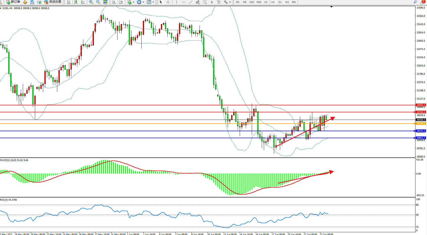 道琼斯指数6月23日(周四)收盘上涨195.02点,涨幅0.64%,报30678.15点;鲍威尔重申致力于对抗通胀的承诺,而且劳动力市场的强势不可持续,这些言论激起了人们对更多加息的担忧。