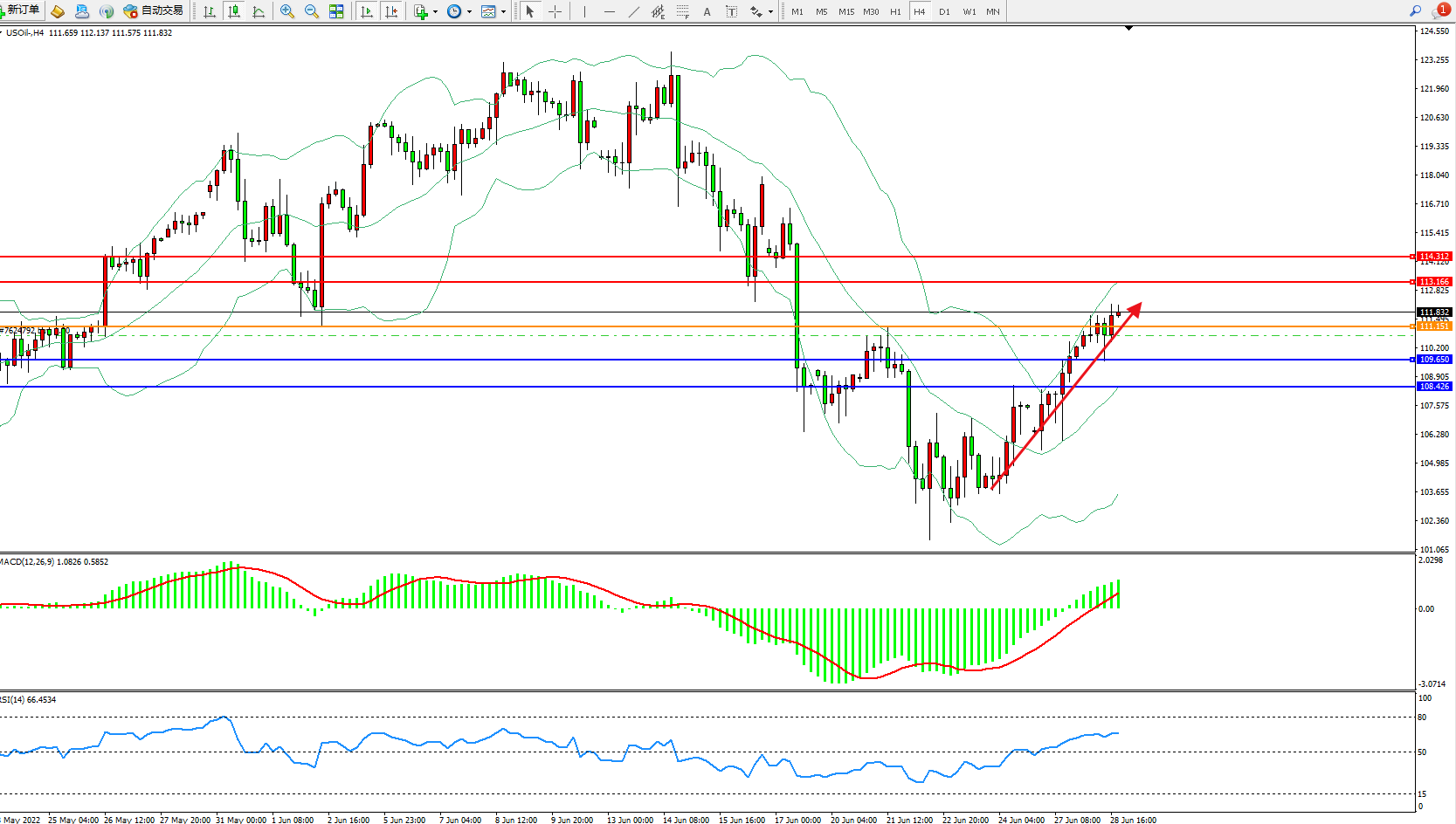 原油维持111.832附近震荡,美国截至6月24日当周API原油库存意外下降,抹去前周增幅,汽油库存连续第二周上升。美、布两油价差中显露出来,价差扩大到6.19美元,为近三个月来最大。