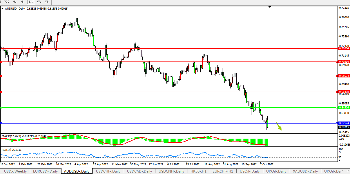 日线图看:短期汇价整理后再度下挫,MACD运行于0轴下方且量能持续放量,RSI持续走弱,预计汇价大概率短期将继续下行。