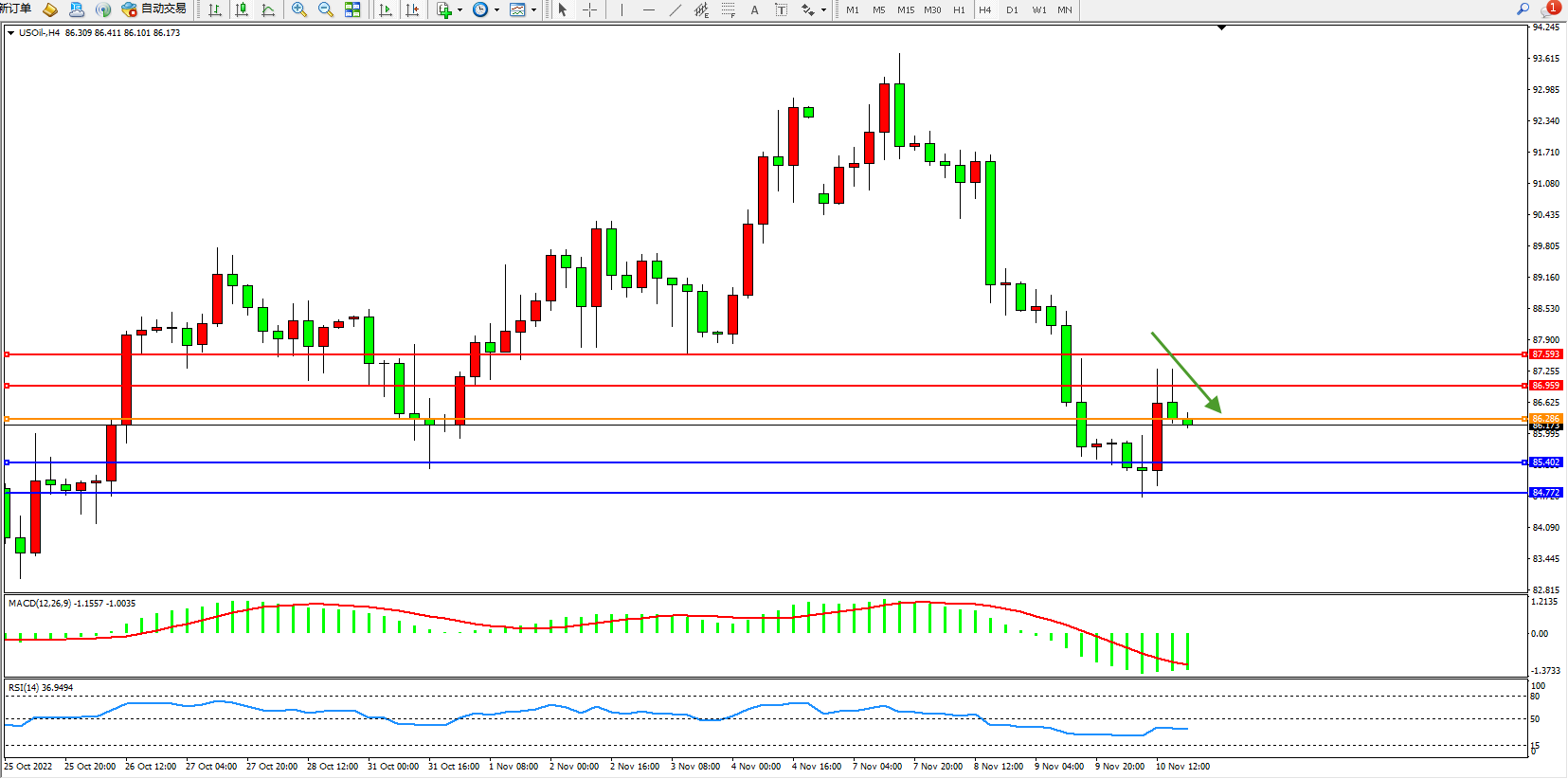 原油维持86.175附近震荡,随着欧盟对俄罗斯原油的进口禁令于12月生效,俄罗斯石油产量可能会在当月降至900万桶/天。预计,与6月至10月的平均水平相比,12月的日产量将减少150-170万桶,降幅为14%。