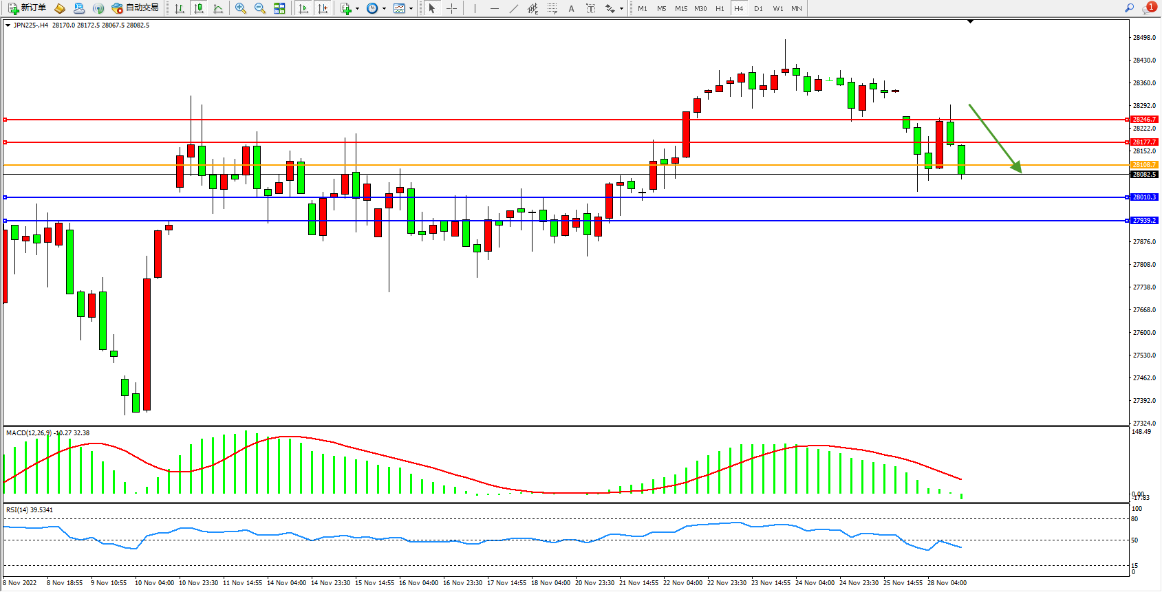 日经225指数11月28日(周一)收盘下跌148.53点,跌幅0.53%,报28134.50点。日本央行行长黑田东彦:紧缩的劳动力市场将有助于推动未来的工资上涨,预计工资的上行压力将逐步加大,没有必要在2013年联合声明中审查政府和日本央行各自的角色,很难将实际工资增长作为货币政策目标。
