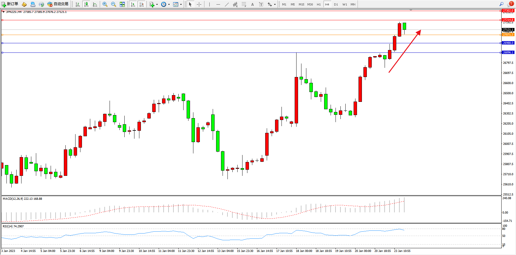 日经225指数1月23日(周一)收盘上涨356.97点,涨幅1.34%,报26910.50点。根据国际货币基金组织(IMF)的经济预测数据,2022年名义GDP(预测值)排在第三位的日本,到2023年的名义GDP为4.3006万亿美元,而德国为4.311万亿美元。 根据IMF的预测,即使日本在2023至2027年能勉强避免被赶超,但到2023年日德两国GPD(预测值)差距将缩小至6.7%左右。