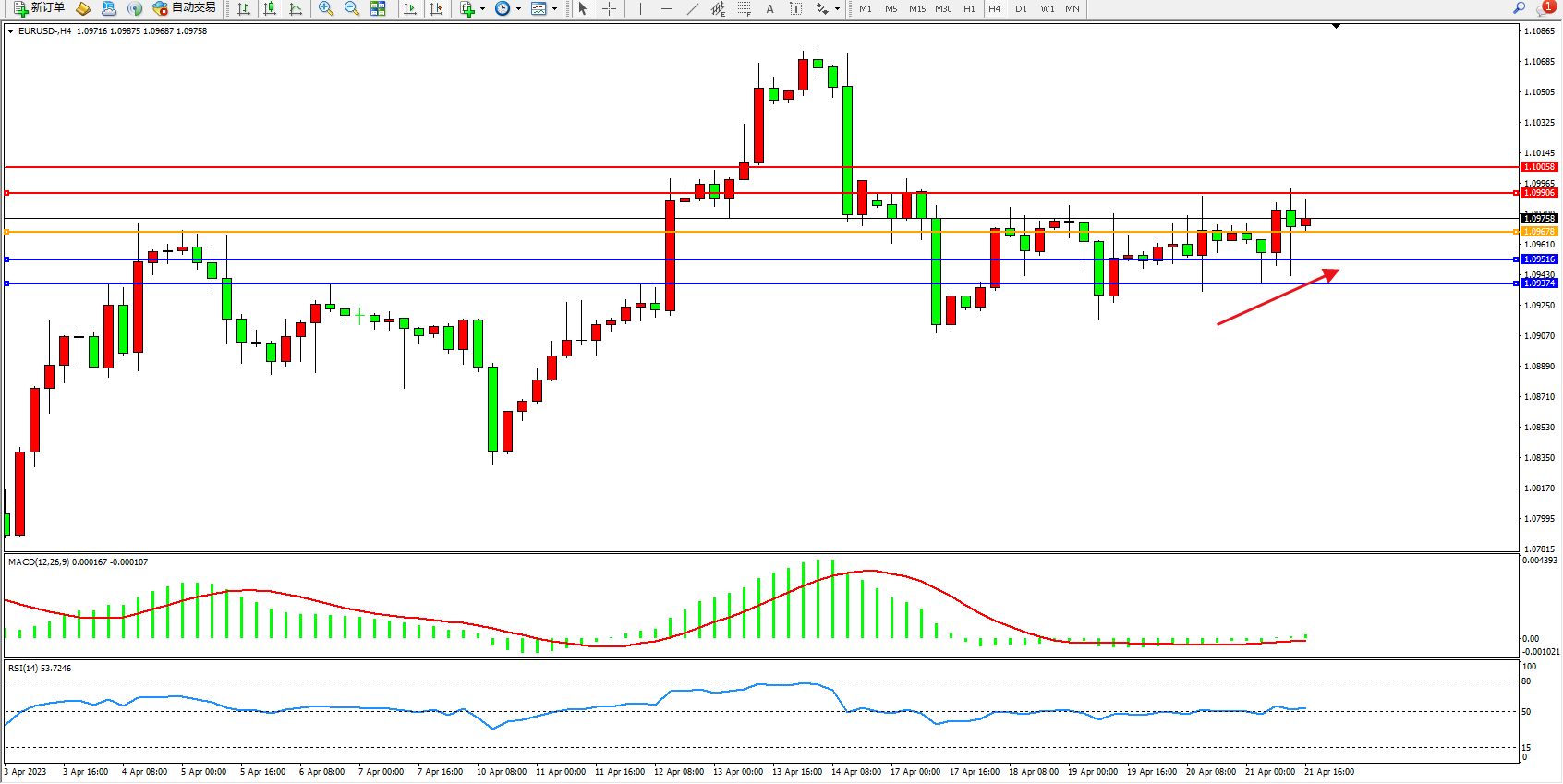 欧元美元EURUSD—4小时K线图显示: