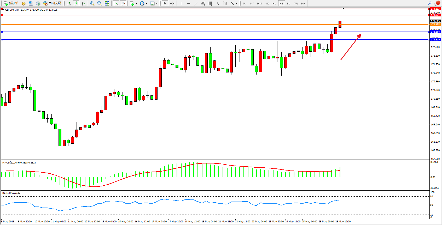 4小时图看:高位多头动力持续上扬,短期看涨情绪笼罩,市场多头有继续攀升态势,MACD指标处于多头区域持续上行,RSI指标处于多头区域震荡上移;