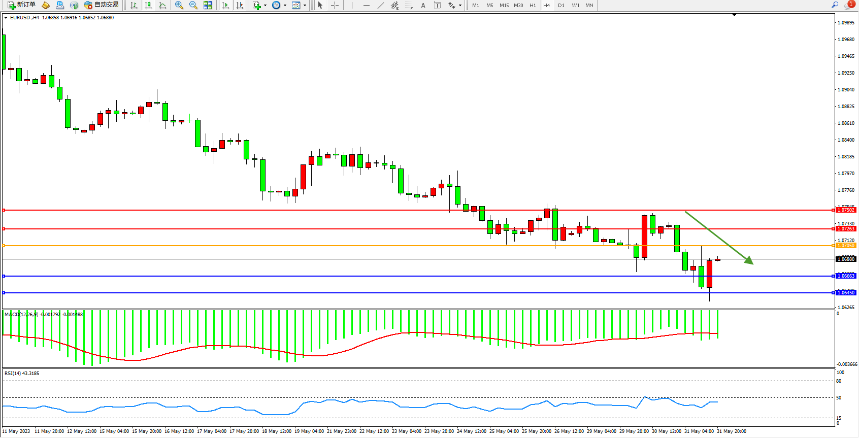 欧元美元EURUSD—4小时K线图显示: