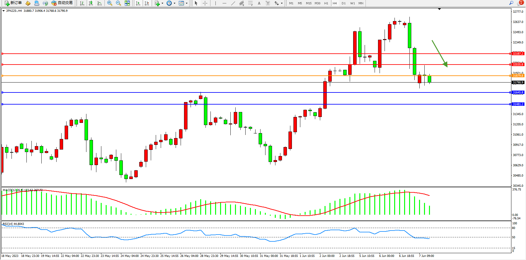 日经225指数6月7日(周三)收盘下跌589.28点,跌幅1.81%,报31917.50点。日本内阁府4月日本商业景气趋势指数(以2015年为100基值)。一致指数(表示当前景气程度)为99.4,较上一个月上涨0.2,已连续上涨3个月。同时先行指数(表示预期景气程度)为97.6,较上个月上涨0.7,时隔两个月再度上涨。
