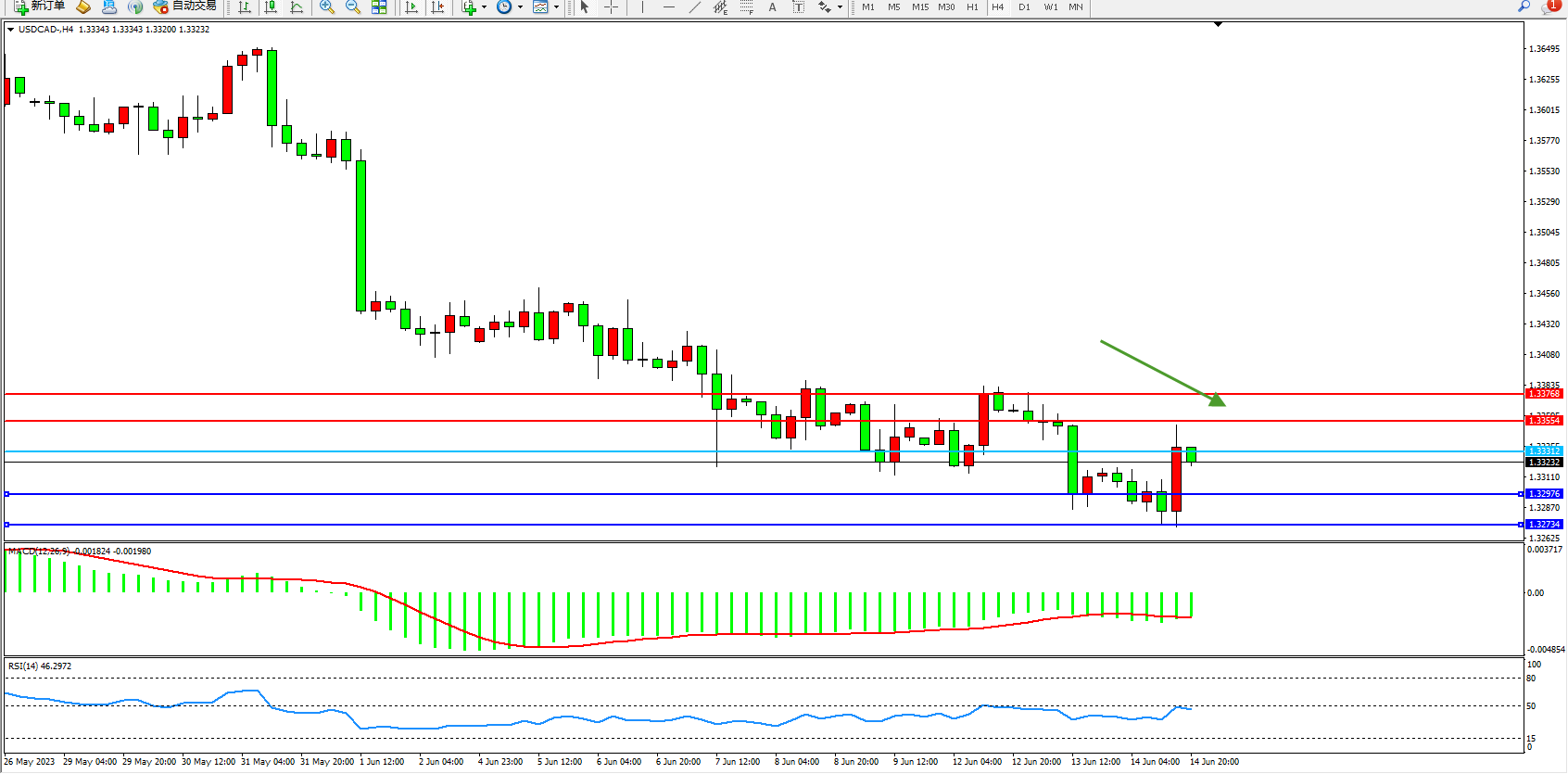 美元兑加元维持1.33232附近震荡,市场预计加拿大央行将在7月再次加息,至5.00%,加拿大央行指出货币政策的限制性不够,并显示出对通胀可能明显高于2%目标的担忧。