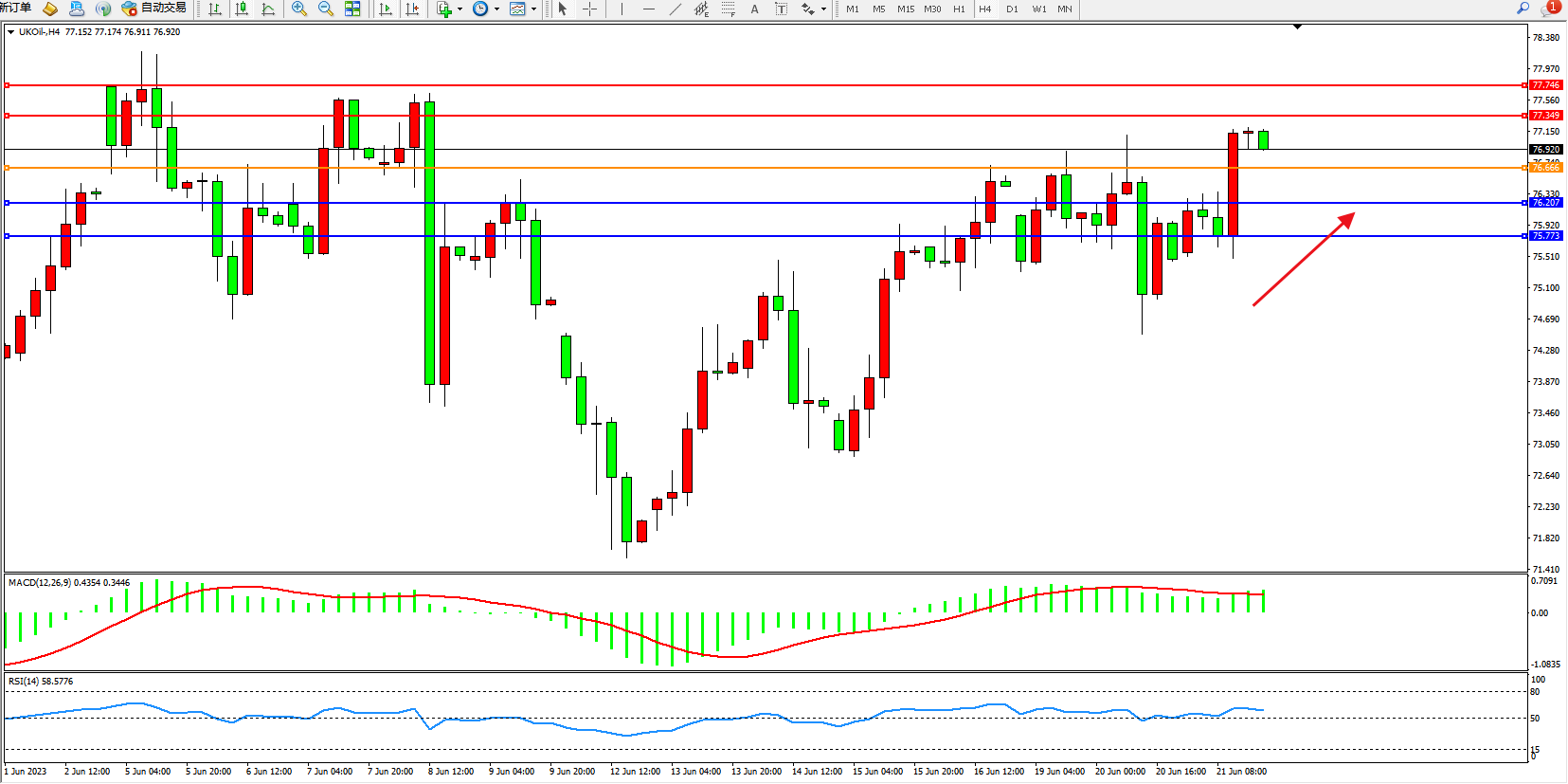 交易策略:76.666上方看涨,目标77.349 77.746