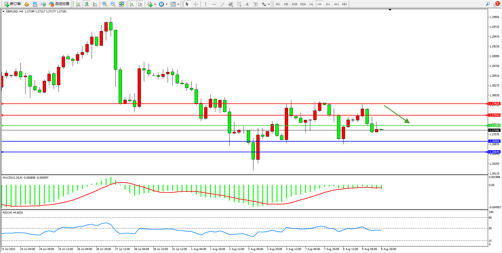 4小时图看:空头动力低位维持震荡向下移动,短期跌势或将延续,市场整体有继续向下移动迹象,MACD指标处于0轴线下侧弱势整理,RSI指标处于50均衡线下侧弱势徘徊;