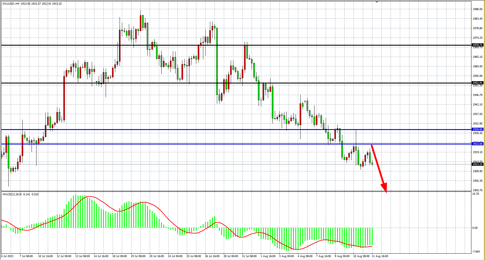 4小时图看,黄金维持在1920下方,MACD量能维持零轴下,走势延续空头行情,阻力继续关注1923-1930附近,支撑关注1900关口。