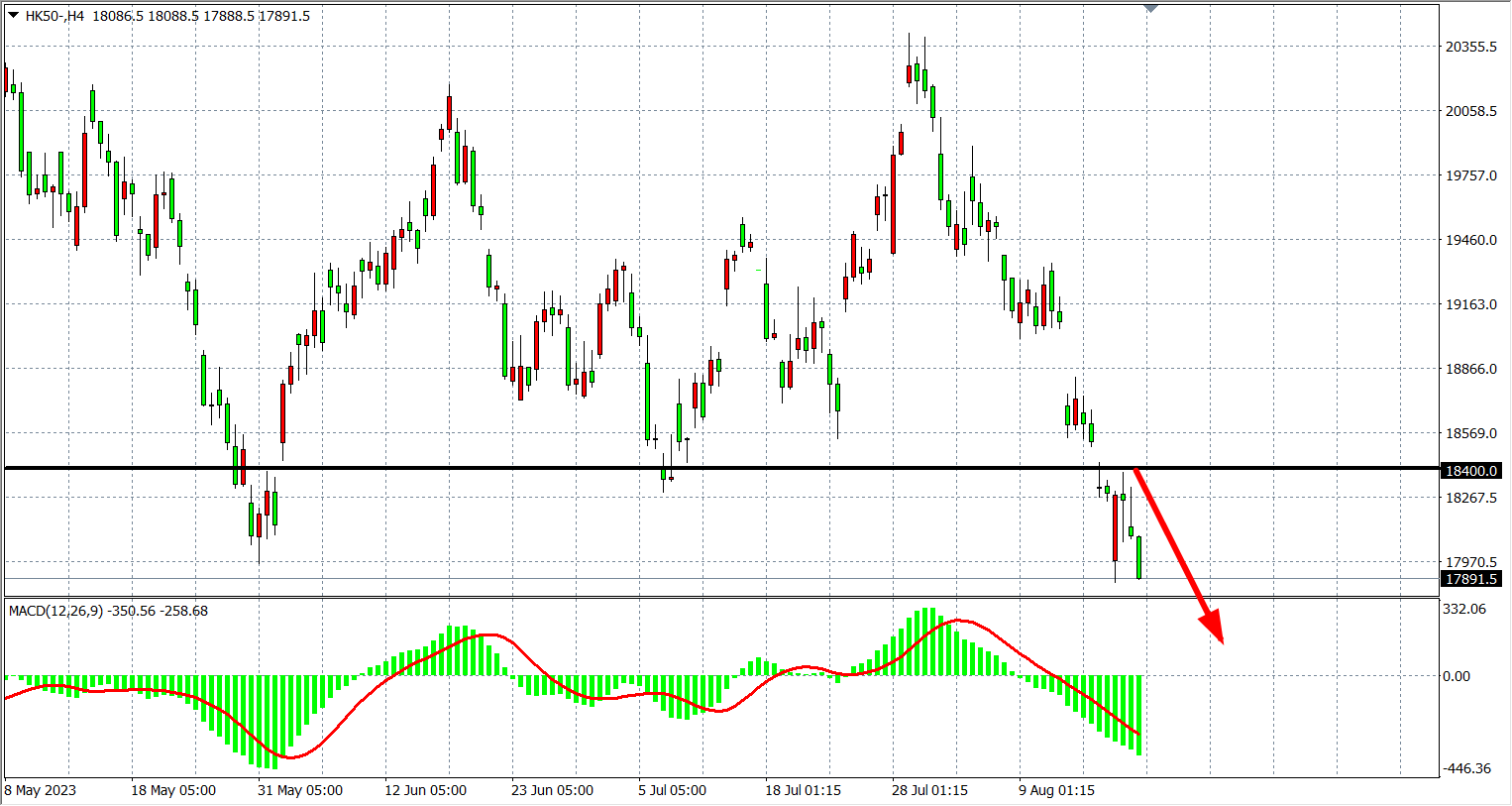 4小时图看,恒指在反弹18400附近再度受阻回落,MACD量能继续于零轴下方放量,阻力继续关注18400-18800。