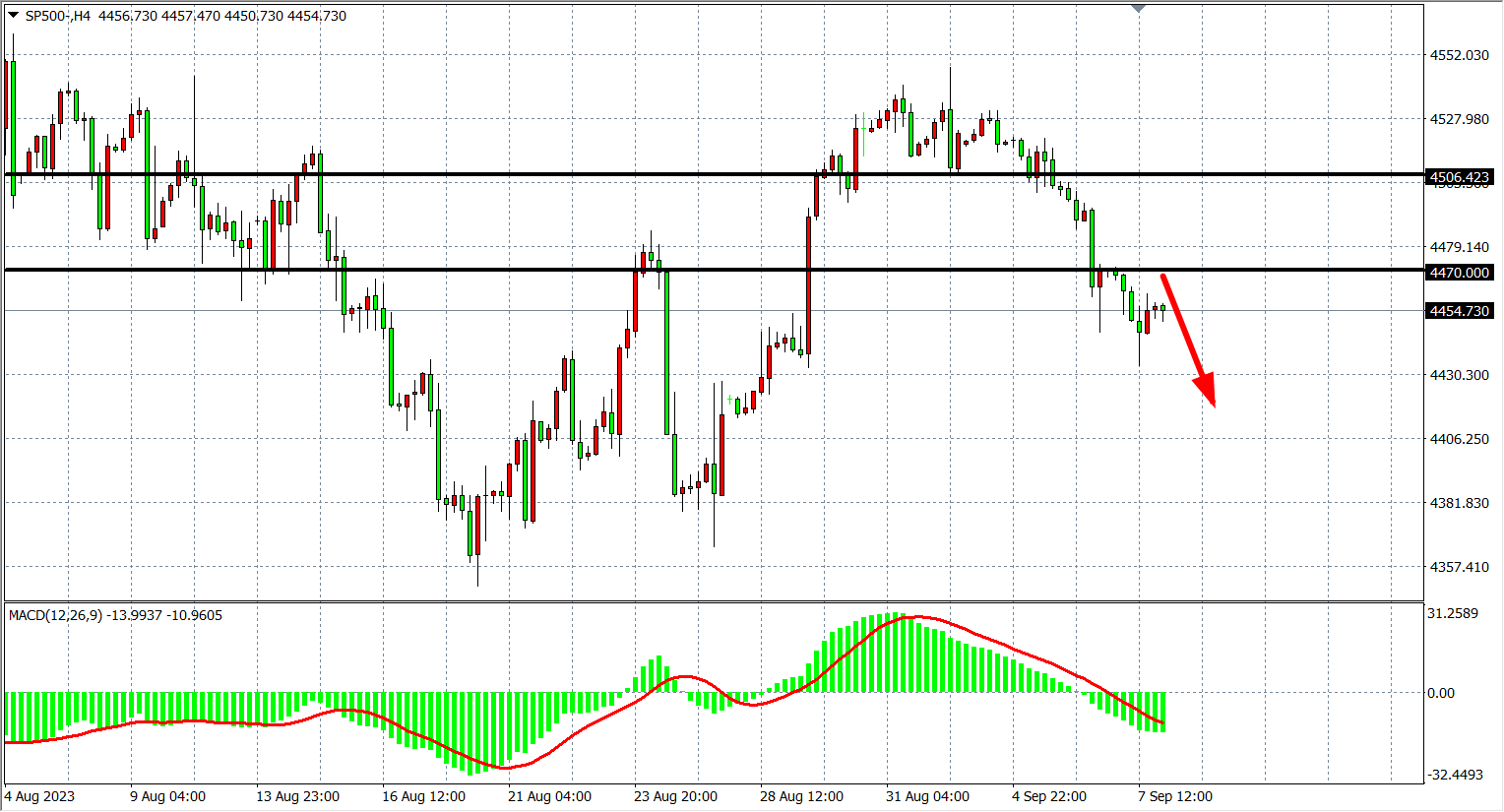 4小时图看,标普进一步下跌,MACD量能在零轴下放量,行情延续走空,阻力下移4470-4500附近,下方支撑看4420-4390。
