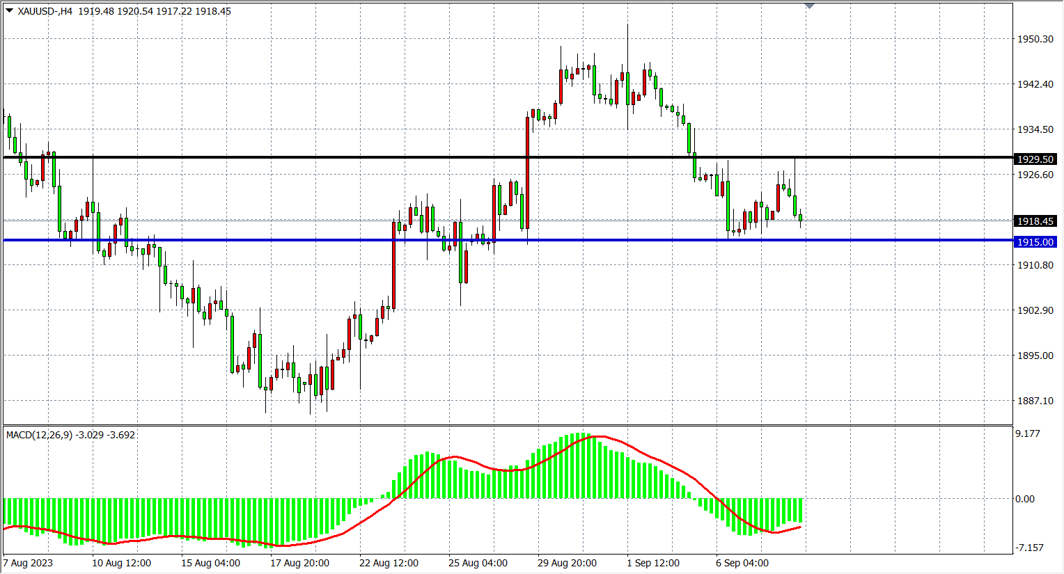 4小时图看,黄金反弹1930附近再度受阻 回落,MACD在零轴下缩量,短期趋势进入盘整,支撑关注1915附近,上方阻力看1930-1940附近。