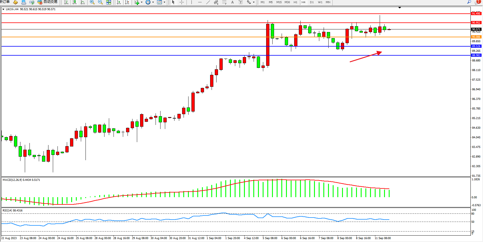 布油维持90.571附近震荡,布伦特原油价格仍在每桶90美元上方徘徊,主要受沙特和俄罗斯延长减产后供应收紧的支撑。市场消息:沙特向至少两个亚洲买家提供了全部的合约原油供应量。