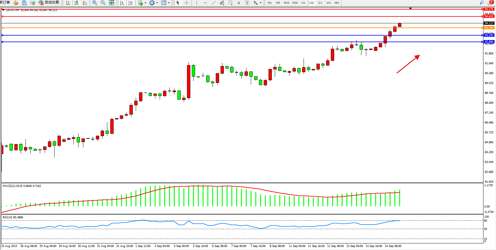 布油维持94.123附近震荡,布伦特原油市场在最近的交易日中表现出上涨势头,90 美元水平是可靠的支撑位。随着过去几天势头减弱,市场立即在该水平找到支撑。