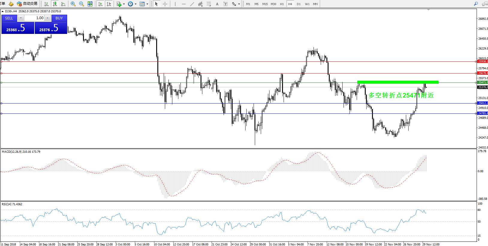 交易策略:破位多空转折点25471上行做多,目标25678——25938