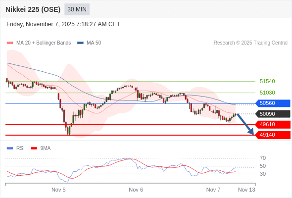 日经225股指期货 (OSE) 当日内: 短期关键阻力位在50560。