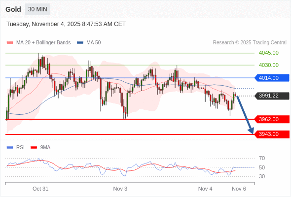 在 4014.00 之下,看跌,目标价位为 3962.00 ,然后为 3943.00 。