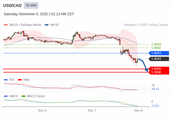 美元/加元 当日内 : 看跌,在 1.4063 之下。