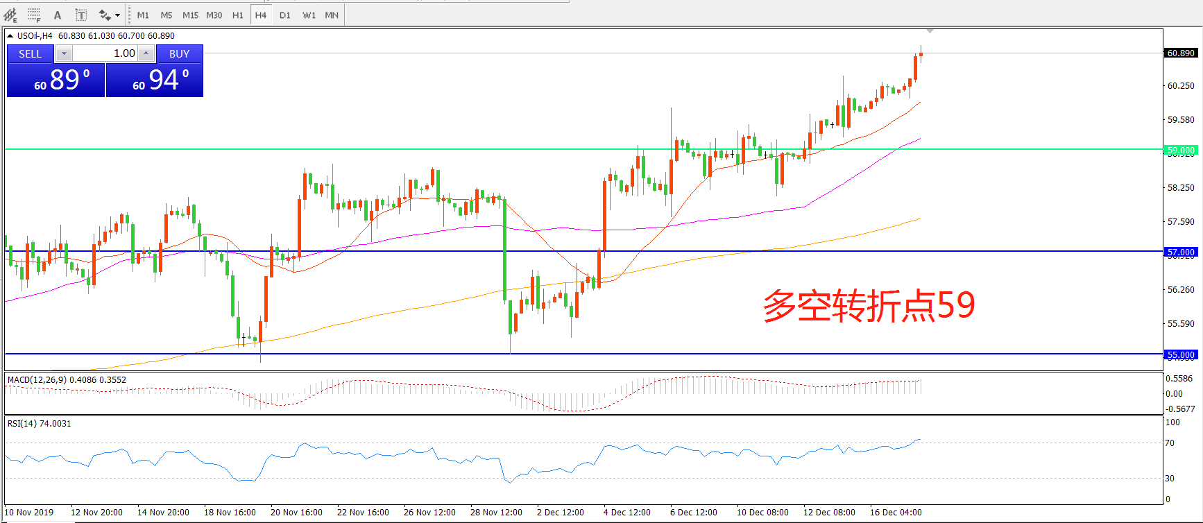 4小时图看,油价连续反弹,整体走势偏强,59美元被突破后,有加速上行的趋势,均线系统呈多头排列,MACD红柱增加,RSI指标走平,日内延续上行概率较大。