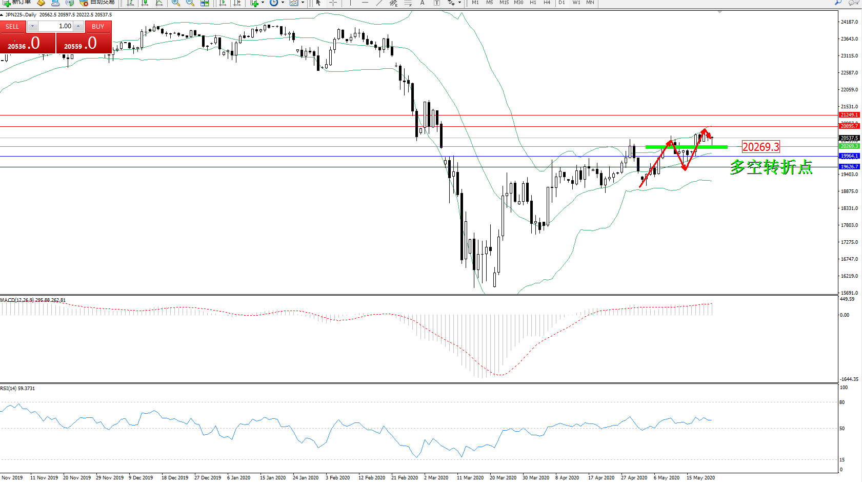 日经225指数522日(周五)收盘下跌165.31点,跌幅0.80%,报20387.00点。日本央行推出了一项新的贷款计划,以支持在疫情期间陷入困境的小企业,但没有增加大规模刺激措施。日本央行维持政策利率和资产购买规模不变,同时敲定了行长黑田东彦上个月要求员工拟定的贷款计划的细节,商品货币集体承压,日内亚洲股市大跌,大宗商品大幅下跌,场对国际贸易局势的担忧情绪升温、疫情二次爆发担忧情绪等因素,全球股市大幅下跌,打压全球经济前景预期,就目前而言,日本央行的侧重点已经转向预防破产、挽救就业以及防止经济衰退演变为金融危机。六月开始新的借贷项目,特别计划规模约为75万亿日元。