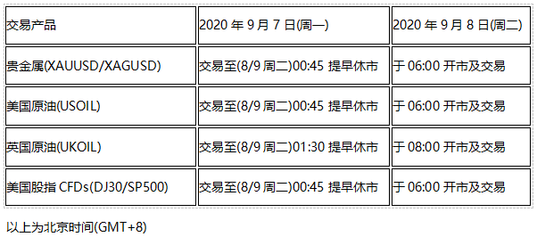因应北美地区市场劳动节假期(2020年9月7日, 周一),以下产品的交易时间将于假期当天提早休市,敬请知悉留意!